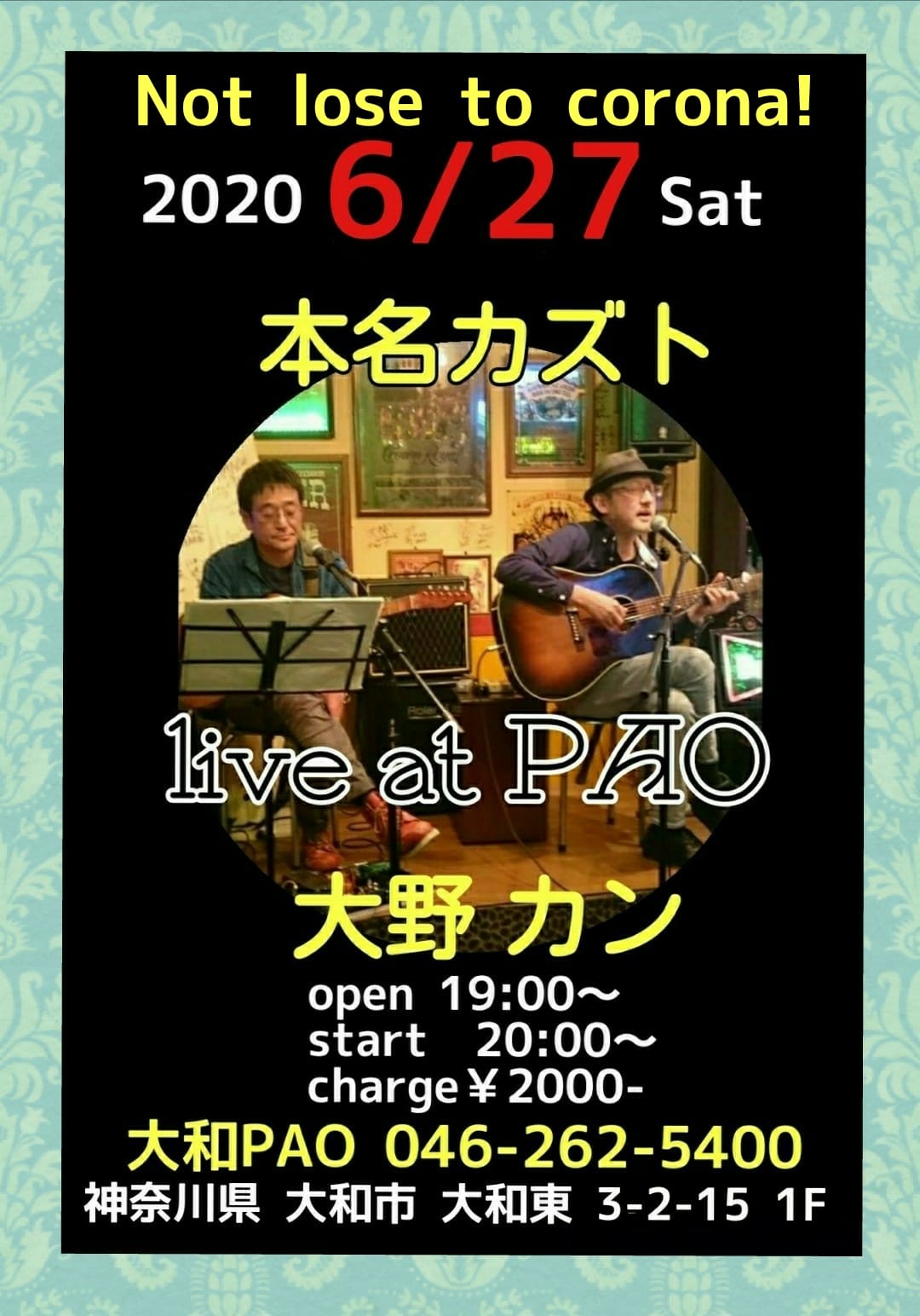 2020/9/26(土)大和市 本名カズト & 大野カン [フライヤー] * ※留意事項※ 換気、消毒はもちろん、 ステージと客席との間にビニールシートの仕切りを立てるなど お店側も万全を期しておりますが、 くれぐれもマスク着用の上お出で下さい。 * 開場/開演:19:00/20:00〜 会場:大和『PAO』 神奈川県大和市大和東3-2-15 小田急・相鉄 徒歩5分大和駅から287m TEL:046-262-5400