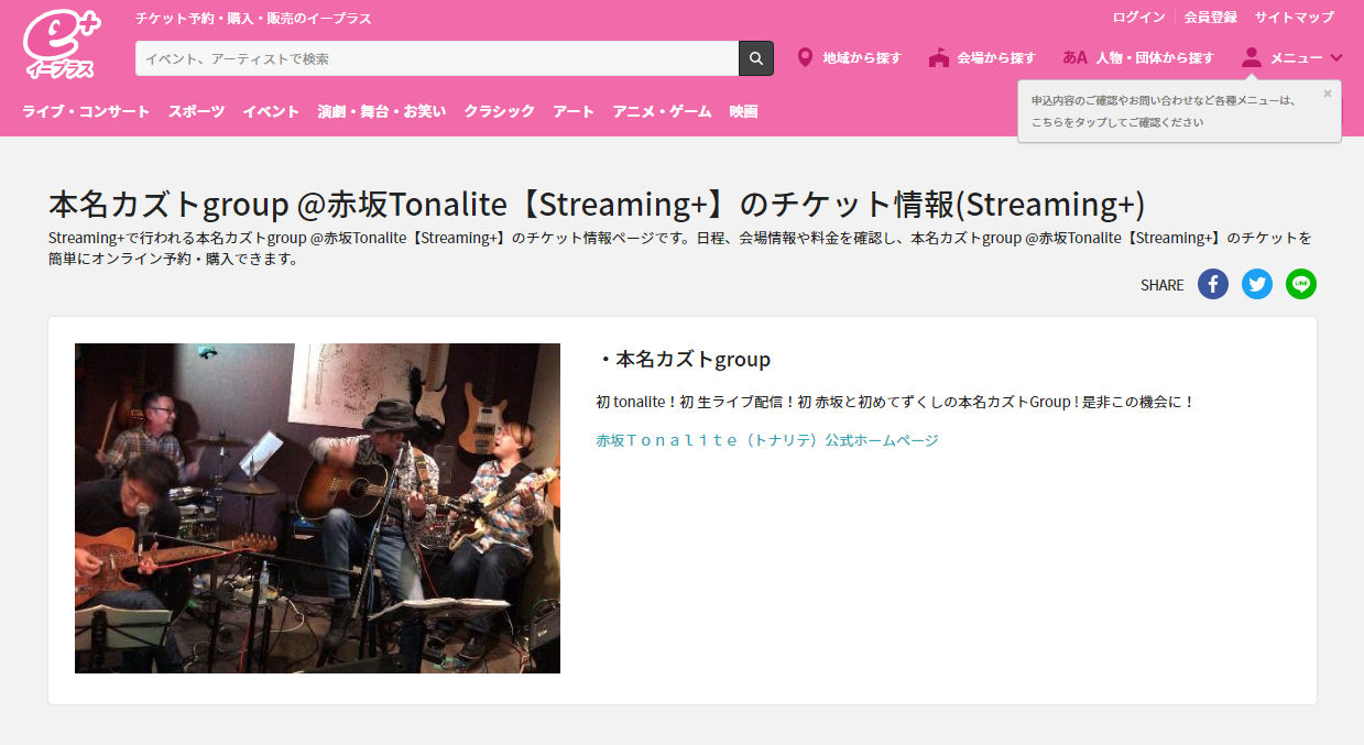 ※写真はFFRでの本名カズトgroup 7月25日(土)19:30より、 本名カズトgroupが、赤坂『tonalite』での ライブを生配信することになりました。 遠方の方、ご都合の合わない方、 ご自宅や出先でゆったりとリラックスしながら 本名カズトgroupのライブ中継をお楽しみ下さい。 配信希望の方は、イープラスにてアカウントを取得後、 電子チケット(1000yen)をご購入下さい。 詳細は下記の クリックして頂くと電子チケット購入のページに 跳べますのでそちらをご覧下さい。 また、当日は無観客ではなく、通常ライブですので、 お時間の合う方は是非、 会場にて直にライブをお楽しみ下さい (テーブルチャージ1000yen、ミュージックチャージ2000yen)。 この配信で、より多くの方に本名カズトgroupの 音楽を知って欲しいと思っています。 もしよろしければシェア頂ければ幸いです。 僕たちにとって初めての試みですが、 目一杯楽しみたいと思っています。 では7/25にお会いしましょう! by 本名カズト 【LIVE情報】 会場:赤坂『tonalite』 〒107−0052 東京都港区赤坂3−16−4 DMK赤坂ビルB1F TEL/FAX:03−6441−0362 * * 開演:1st 19:30〜20:20/2nd 20:50〜21:40 料金:テーブルチャージ\1,000+ミュージックチャージ\2,000 出演:本名カズトgroup 本名カズト(vo&g&p) 店舗HP: https://www.akasakatonalite.com/